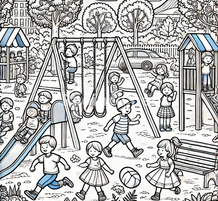 This charming coloring page features children having a delightful time in the park. A group of kids is playing on a swing set, while others enjoy sliding down a bright slide. Nearby, a few children are engaged in a lively ball game, adding energy to the scene. The page is designed with bold outlines, making it easy for kids of all ages to color within the lines and express their creativity. This park scene captures the essence of childhood joy, with intricate details that encourage fine motor skills and imagination. Perfect for use at home, in classrooms, or during leisure time, this coloring page offers hours of fun and artistic exploration. Let your kids bring this playful park setting to life with their favorite colors!
