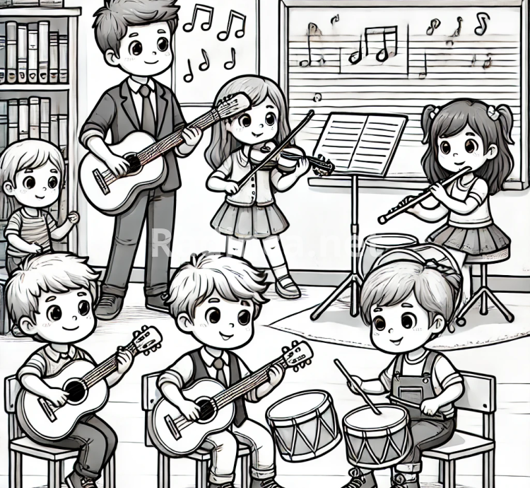 This vibrant coloring page showcases the joy of music as children play various musical instruments in a classroom setting. The scene includes kids strumming guitars, beating drums, and blowing into flutes, while a music teacher conducts enthusiastically. The classroom is filled with musical notes and energy, inviting kids to imagine the sounds while coloring. Designed with bold outlines, this page is perfect for fostering creativity and an appreciation for music. It’s ideal for music class projects, at-home activities, or as a fun addition to any child’s artistic collection. Let your kids fill this lively music scene with their favorite colors, creating a masterpiece that resonates with rhythm and creativity!